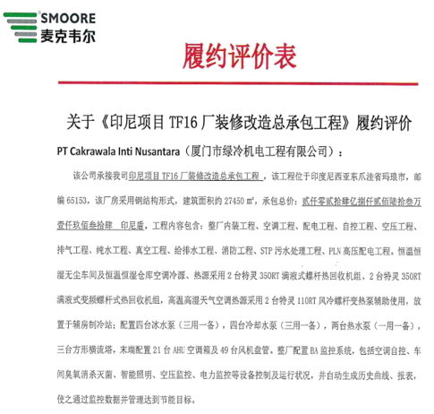 Shenzhen McQuay Indonesia Project TF16 Factory Building Decoration General Contracting Project" Contract Performance Evaluation