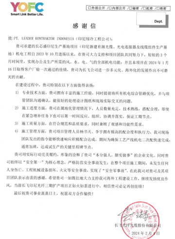 YOFC Optical Fiber and Cable Co., Ltd. Changxinsheng Indonesia Production Base Project“ Letter of Appreciation